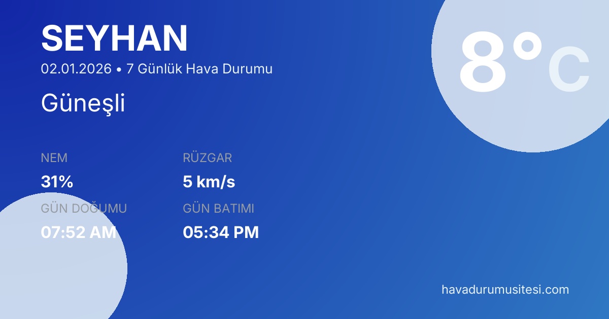 Önümüzdeki 7 gün boyunca sıcaklıkların 3°C ile 18°C arasında seyretmesi beklenmektedir. 7 gün güneşli hava beklenmektedir. Seyhan hava durumu tahminleri düzenli olarak güncellenmektedir. Meteoroloji verileri güvenilir kaynaklardan alınmakta ve sürekli güncellenmektedir. Son güncelleme: 02.01.2026 13:52