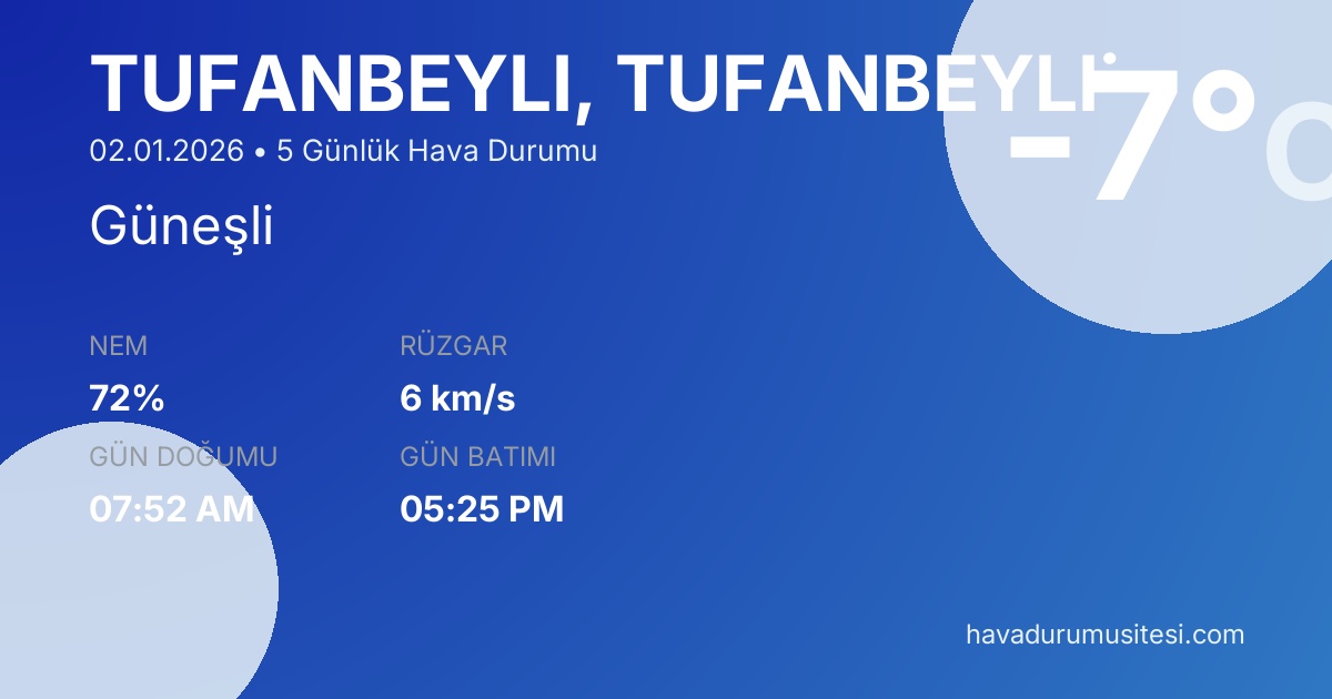 Tufanbeyli̇ için 5 günlük detaylı hava durumu tahmini. Son güncelleme: 02.01.2026 12:07 | Veriler uluslararası meteoroloji standartlarına uygun olarak işlenmektedir.
