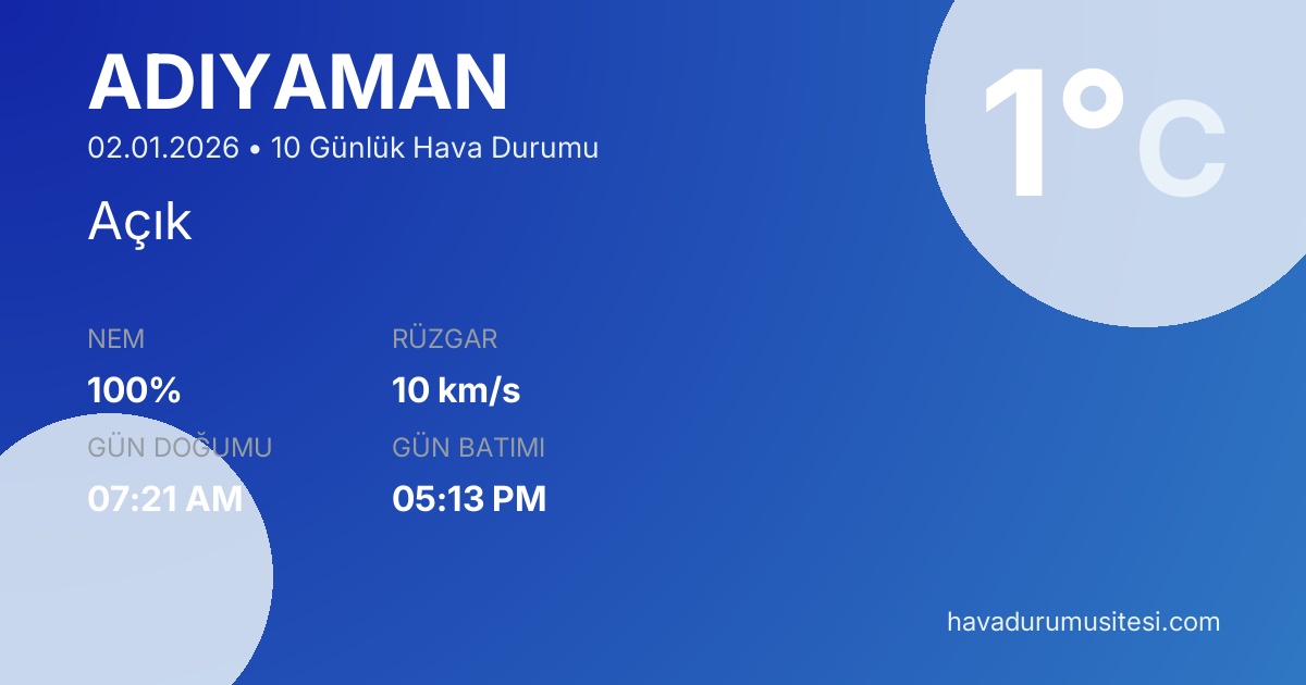 Adiyaman için 10 günlük detaylı hava durumu tahmini. Son güncelleme: 02.01.2026 13:30 | Veriler uluslararası meteoroloji standartlarına uygun olarak işlenmektedir.