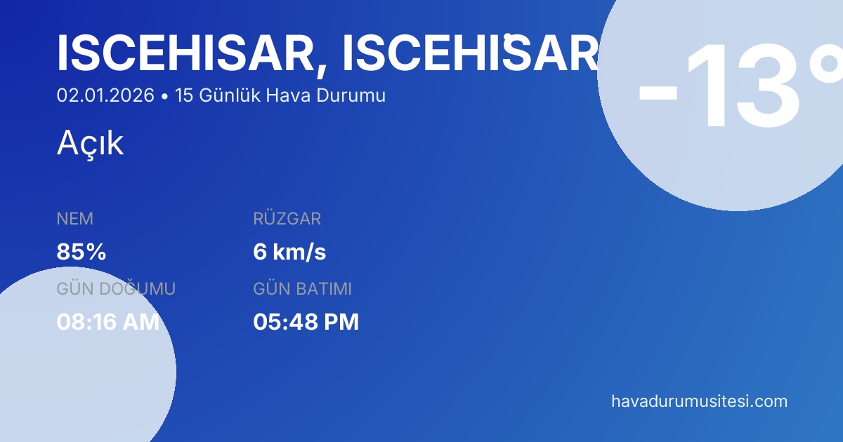 Önümüzdeki 15 gün boyunca İscehi̇sar ilçesinde sıcaklıkların -12°C ile 15°C arasında seyretmesi beklenmektedir. Ortalama sıcaklık 2°C civarında olacaktır. 10 gün güneşli ve açık hava koşulları hakim olacak. Yaklaşık 1 gün yağışlı geçmesi bekleniyor. Kış mevsiminin özelliklerini taşıyan bu dönemde hava durumu tahminlerini düzenli takip etmeniz önerilir.