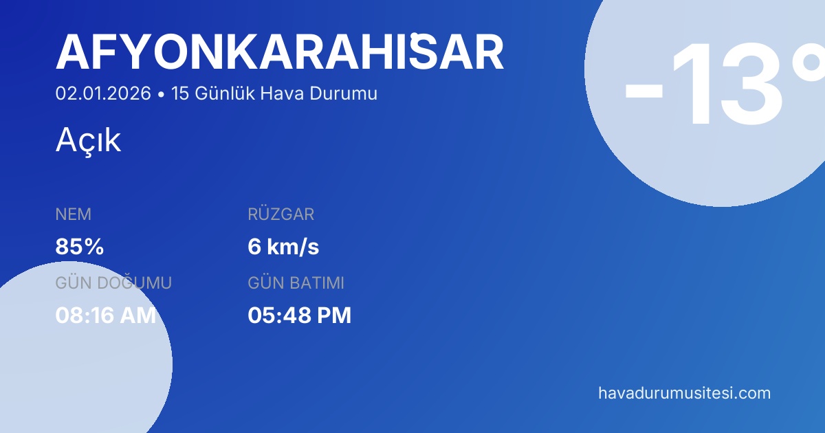 Afyonkarahi̇sar 15 günlük hava durumu tahminleri düzenli olarak güncellenmektedir. Meteoroloji verileri güvenilir kaynaklardan alınmakta ve sürekli güncellenmektedir. Son güncelleme: 02.01.2026 07:22