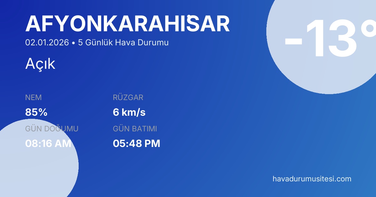 Önümüzdeki 5 gün boyunca sıcaklıkların -13°C ile 14°C arasında seyretmesi beklenmektedir. 5 gün güneşli hava beklenmektedir. Afyonkarahi̇sar hava durumu tahminleri düzenli olarak güncellenmektedir. Meteoroloji verileri güvenilir kaynaklardan alınmakta ve sürekli güncellenmektedir. Son güncelleme: 02.01.2026 07:20