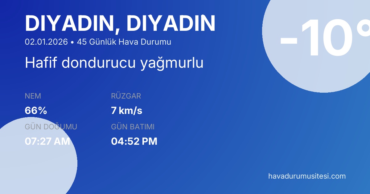 Di̇yadi̇n için 45 günlük hava durumu tahminleri. Şu anda sıcaklık -10°C ve hava durumu Hafif dondurucu yağmurlu. Hissedilen sıcaklık -15°C. Nem oranı %66. Rüzgar hızı 7 km/s. Di̇yadi̇n için güncel meteoroloji bilgileri, bugünkü hava durumu, yarınki tahmin ve 48 saatlik saatlik analiz sayfalarımızda detaylı bilgiler bulunmaktadır.