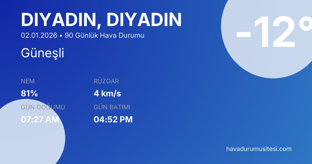 Önümüzdeki 90 gün boyunca sıcaklıkların -19°C ile 8°C arasında seyretmesi beklenmektedir. 37 gün yağışlı geçecek. 4 gün güneşli hava beklenmektedir. Di̇yadi̇n hava durumu tahminleri düzenli olarak güncellenmektedir. Meteoroloji verileri güvenilir kaynaklardan alınmakta ve sürekli güncellenmektedir. Son güncelleme: 02.01.2026 15:22