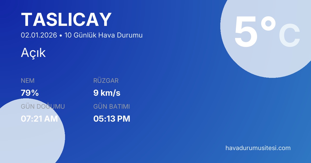 Taşliçay için 10 günlük detaylı hava durumu tahmini. Son güncelleme: 02.01.2026 09:59 | Veriler uluslararası meteoroloji standartlarına uygun olarak işlenmektedir.