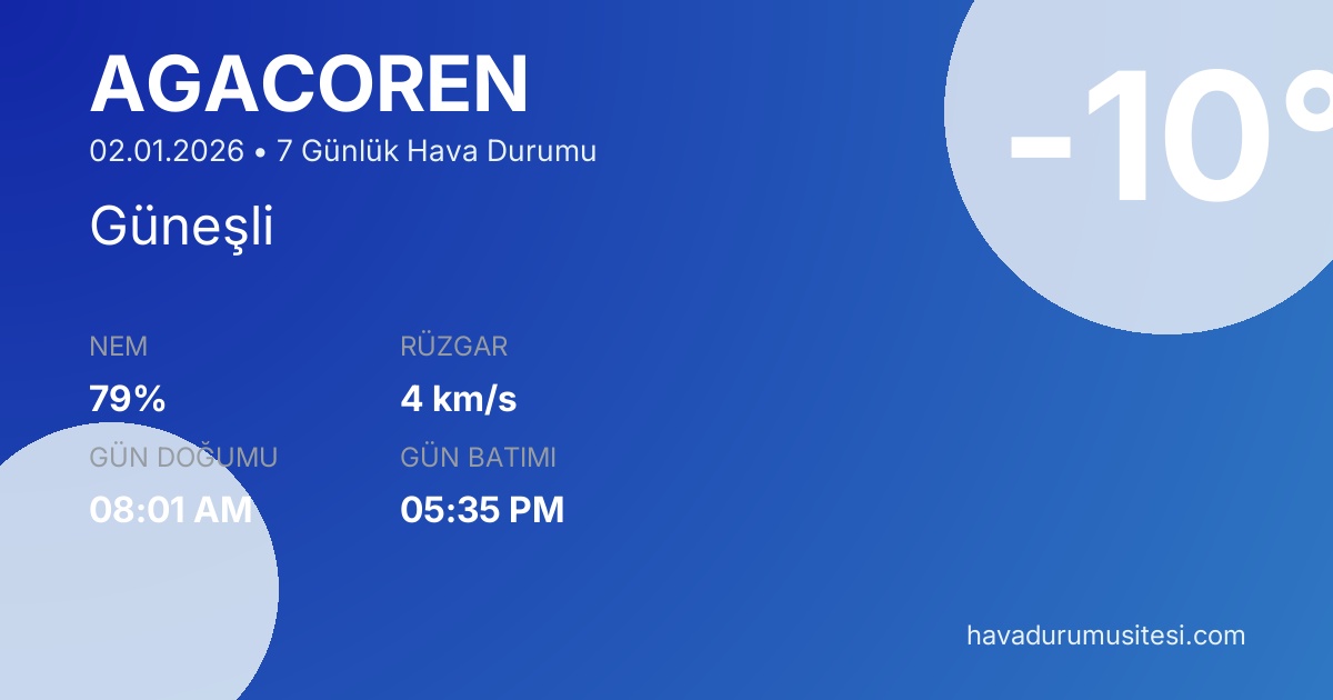 Ağaçören için 7 günlük detaylı hava durumu tahmini. Son güncelleme: 02.01.2026 13:40 | Veriler uluslararası meteoroloji standartlarına uygun olarak işlenmektedir.