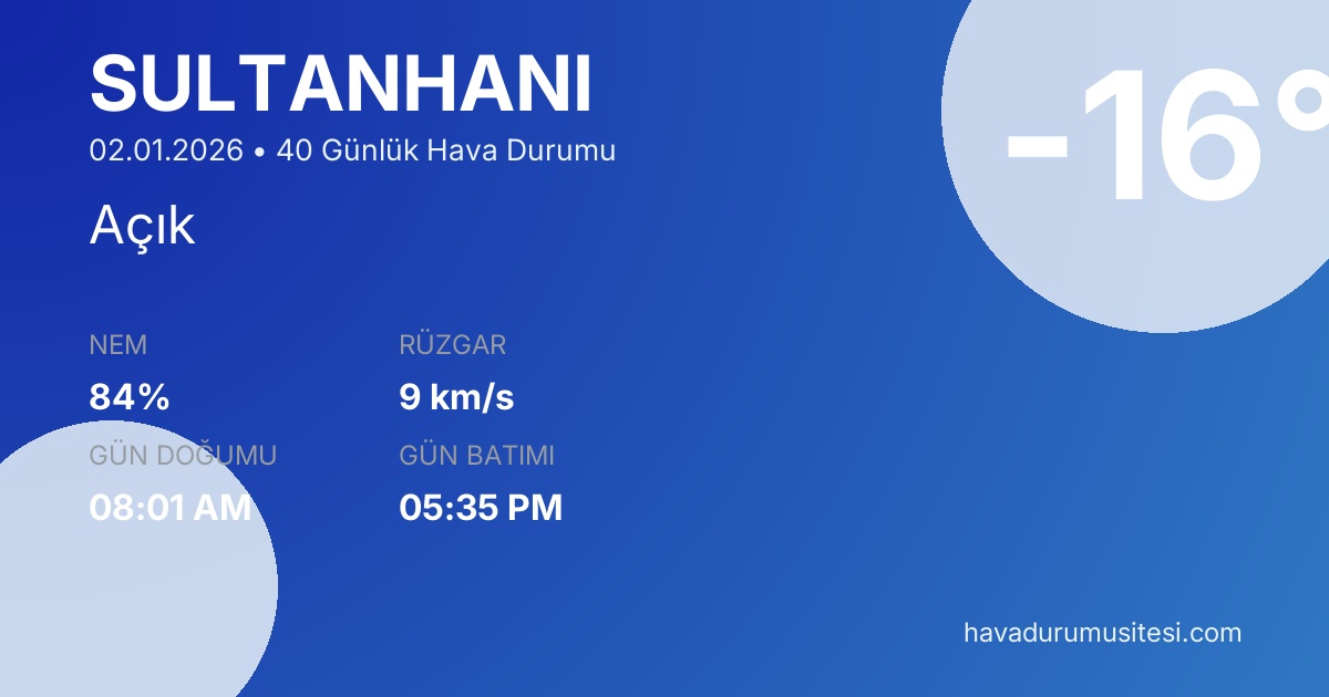 Önümüzdeki 40 gün boyunca sıcaklıkların -11°C ile 16°C arasında seyretmesi beklenmektedir. 9 gün yağışlı geçecek. 12 gün güneşli hava beklenmektedir. Sultanhani hava durumu tahminleri düzenli olarak güncellenmektedir. Meteoroloji verileri güvenilir kaynaklardan alınmakta ve sürekli güncellenmektedir. Son güncelleme: 02.01.2026 05:23
