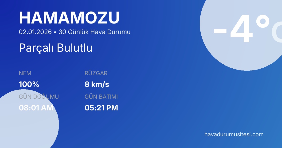 Önümüzdeki 30 gün boyunca sıcaklıkların -11°C ile 10°C arasında seyretmesi beklenmektedir. 10 gün yağışlı geçecek. 6 gün güneşli hava beklenmektedir. Hamamözü hava durumu tahminleri düzenli olarak güncellenmektedir. Meteoroloji verileri güvenilir kaynaklardan alınmakta ve sürekli güncellenmektedir. Son güncelleme: 02.01.2026 17:08