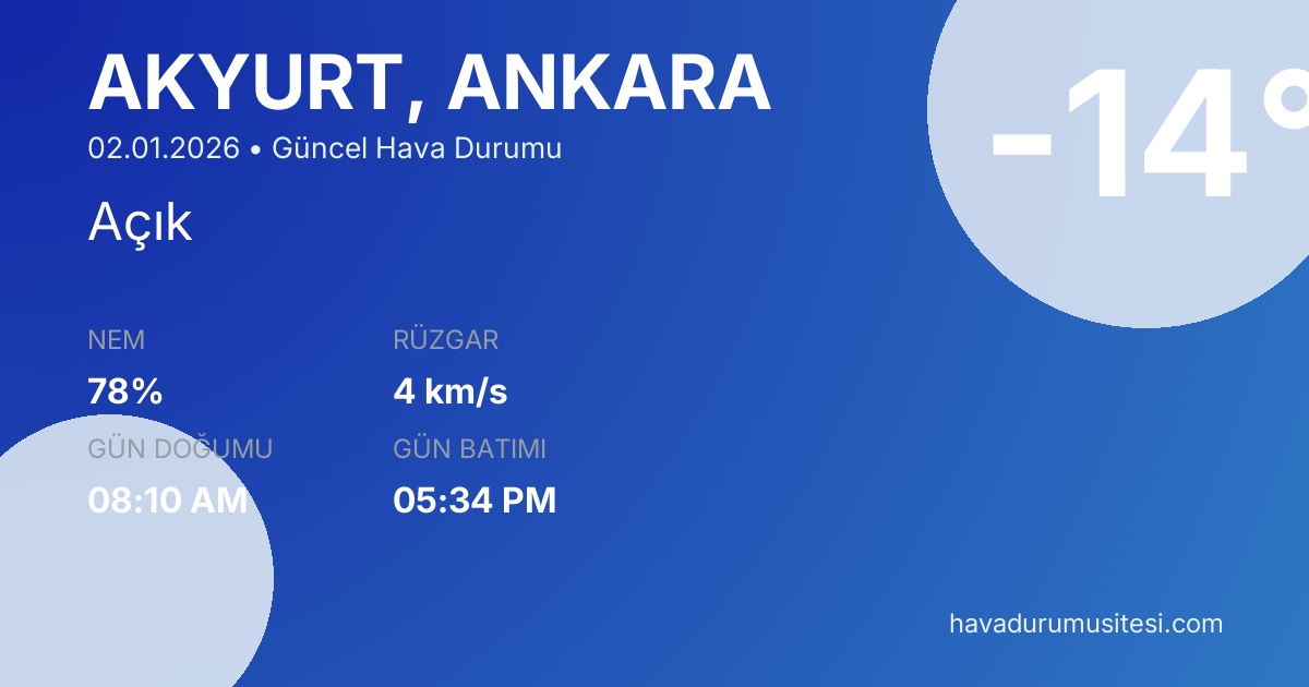 Akyurt ilçesi, Ankara iline bağlıdır. Şu anda sıcaklık -14°C ve hava durumu Açık. Hissedilen sıcaklık -16°C. Nem oranı %78. Rüzgar hızı 4 km/s. Akyurt için bugün hava durumu, yarın hava durumu, 5 günlük tahmin ve 15 günlük tahmin sayfalarımızda detaylı bilgiler bulunmaktadır. Ankara 15 günlük tahmin ve Ankara 30 günlük tahmin sayfalarını da inceleyebilirsiniz.