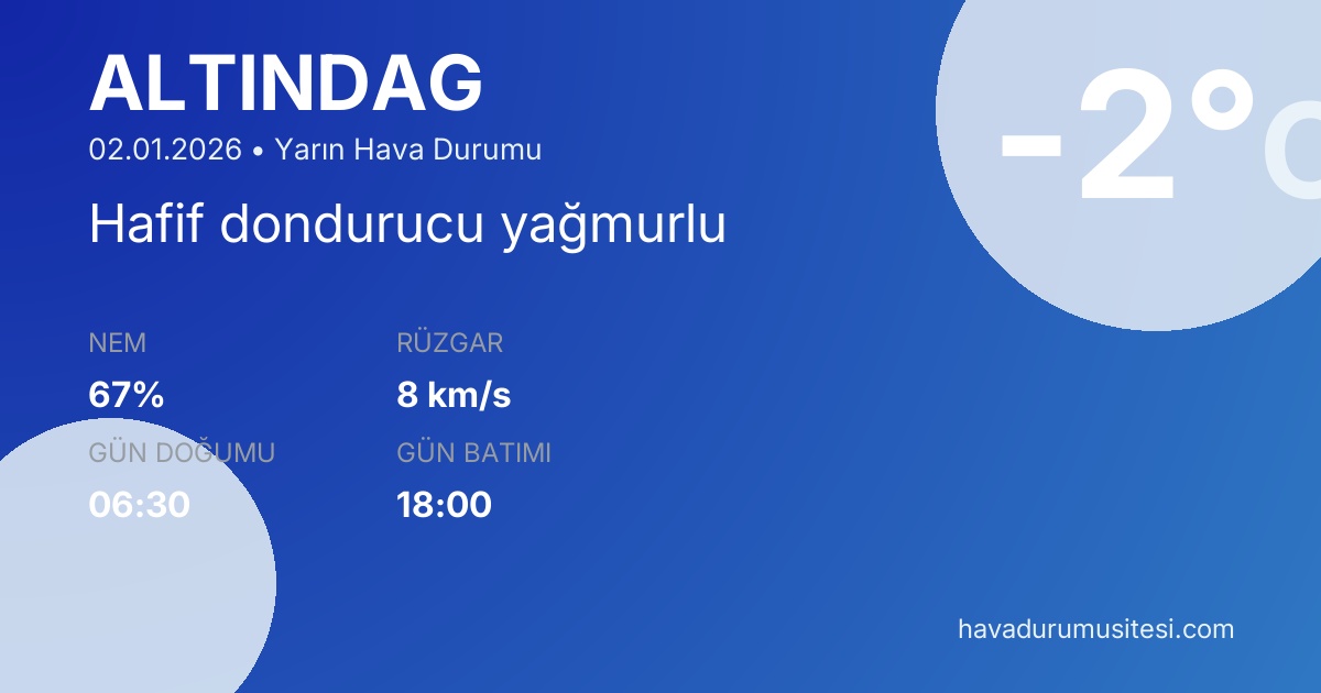Yarın Altindağ ilçesinde sabah saatlerinde minimum -8°C civarında başlayacak sıcaklıklar, öğle ve öğleden sonra saatlerinde maksimum 3°C seviyesine ulaşacaktır. Genel hava durumu Hafif dondurucu yağmurlu olarak tahmin edilmektedir. Yağış ihtimali %74 olduğu için şemsiye veya yağmurluk almanızı öneririz. Daha detaylı saat saat bilgi için Altindağ saatlik hava durumu sayfamızı inceleyebilirsiniz. Ayrıca 5 günlük, 15 günlük ve 30 günlük tahminler ile uzun vadeli planlamalarınızı yapabilirsiniz.
