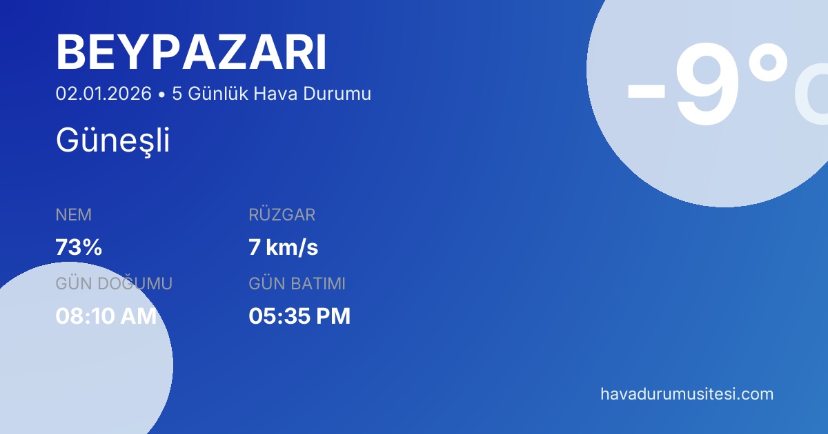 Beypazari için 5 günlük detaylı hava durumu tahmini. Son güncelleme: 02.01.2026 09:56 | Veriler uluslararası meteoroloji standartlarına uygun olarak işlenmektedir.