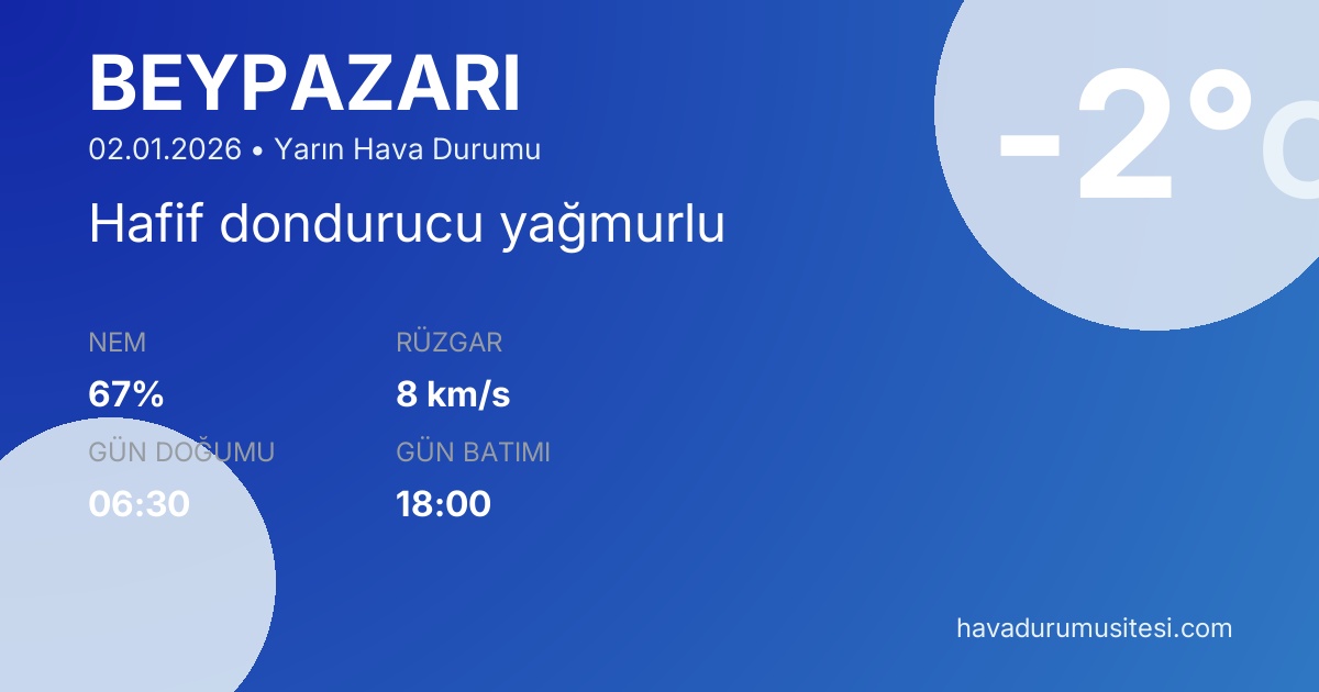 Yarın Beypazari ilçesinde sabah saatlerinde minimum -8°C civarında başlayacak sıcaklıklar, öğle ve öğleden sonra saatlerinde maksimum 3°C seviyesine ulaşacaktır. Genel hava durumu Hafif dondurucu yağmurlu olarak tahmin edilmektedir. Yağış ihtimali %74 olduğu için şemsiye veya yağmurluk almanızı öneririz. Daha detaylı saat saat bilgi için Beypazari saatlik hava durumu sayfamızı inceleyebilirsiniz. Ayrıca 5 günlük, 15 günlük ve 30 günlük tahminler ile uzun vadeli planlamalarınızı yapabilirsiniz.