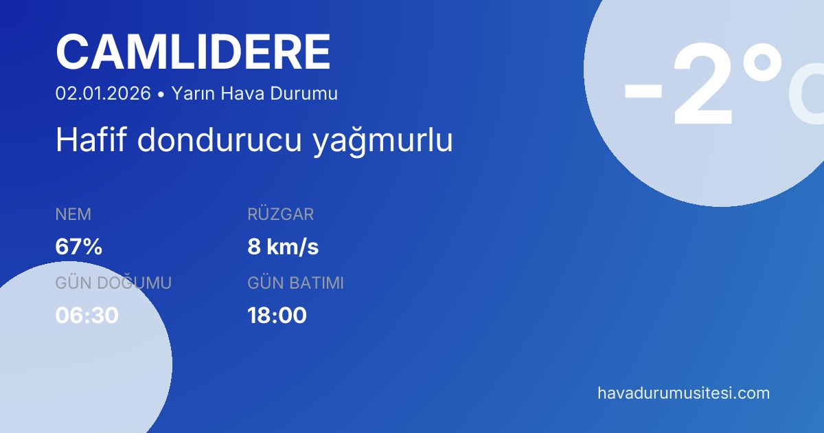 Yarın Çamlidere ilçesinde sabah saatlerinde minimum -8°C civarında başlayacak sıcaklıklar, öğle ve öğleden sonra saatlerinde maksimum 3°C seviyesine ulaşacaktır. Genel hava durumu Hafif dondurucu yağmurlu olarak tahmin edilmektedir. Yağış ihtimali %74 olduğu için şemsiye veya yağmurluk almanızı öneririz. Daha detaylı saat saat bilgi için Çamlidere saatlik hava durumu sayfamızı inceleyebilirsiniz. Ayrıca 5 günlük, 15 günlük ve 30 günlük tahminler ile uzun vadeli planlamalarınızı yapabilirsiniz.