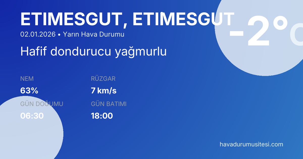 Eti̇mesgut yarın hava durumu tahminleri düzenli olarak güncellenmektedir. Meteoroloji verileri güvenilir kaynaklardan alınmakta ve sürekli güncellenmektedir. Son güncelleme: 02.01.2026 09:07