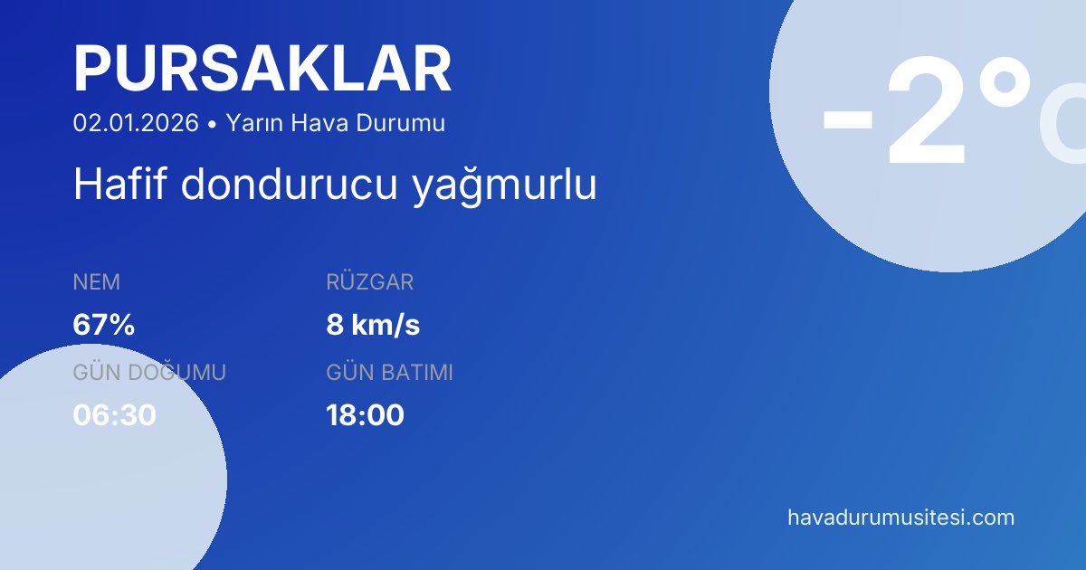 Yarın Pursaklar ilçesinde sabah saatlerinde minimum -8°C civarında başlayacak sıcaklıklar, öğle ve öğleden sonra saatlerinde maksimum 3°C seviyesine ulaşacaktır. Genel hava durumu Hafif dondurucu yağmurlu olarak tahmin edilmektedir. Yağış ihtimali %74 olduğu için şemsiye veya yağmurluk almanızı öneririz. Daha detaylı saat saat bilgi için Pursaklar saatlik hava durumu sayfamızı inceleyebilirsiniz. Ayrıca 5 günlük, 15 günlük ve 30 günlük tahminler ile uzun vadeli planlamalarınızı yapabilirsiniz.