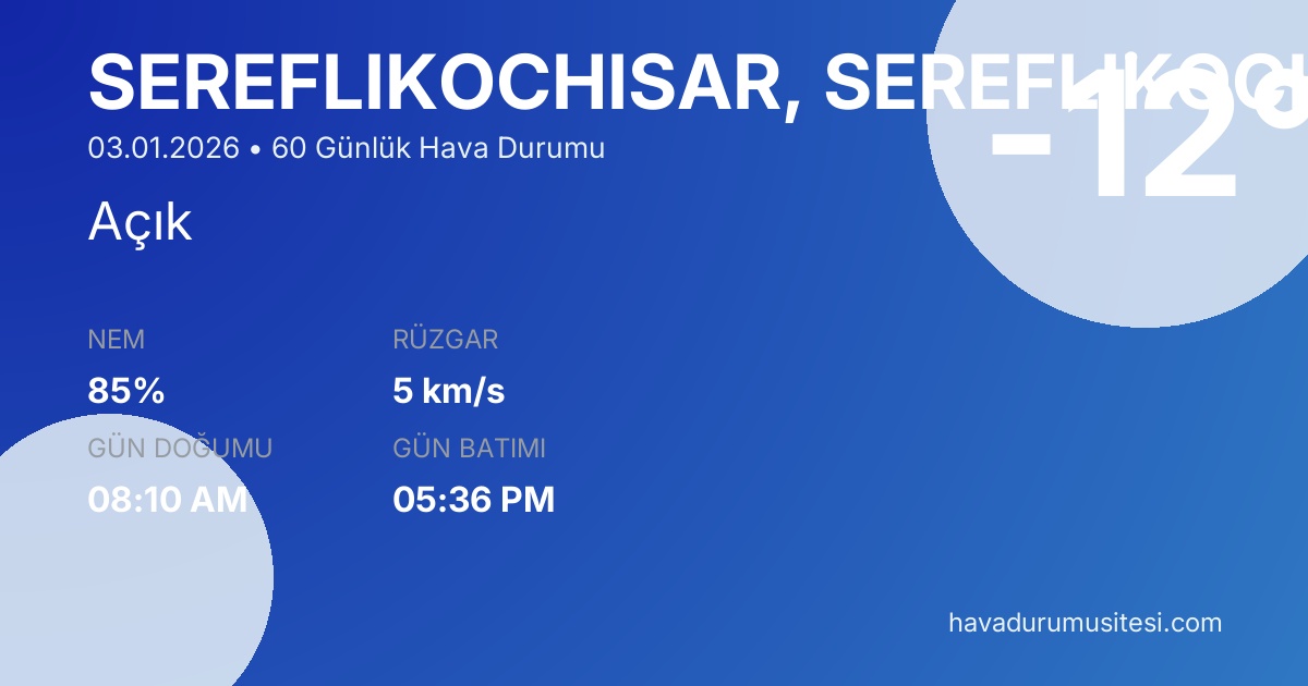 Şerefli̇koçhi̇sar için 60 günlük detaylı hava durumu tahmini. Son güncelleme: 03.01.2026 06:56 | Veriler uluslararası meteoroloji standartlarına uygun olarak işlenmektedir.