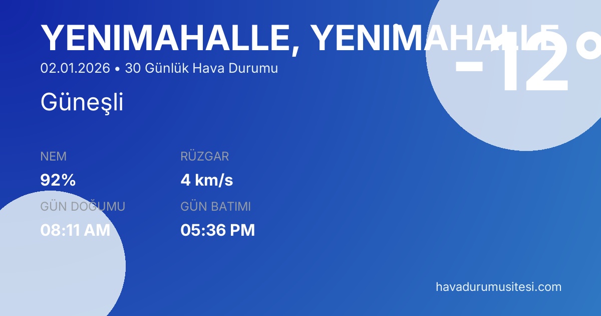 Yeni̇mahalle için 30 günlük detaylı hava durumu tahmini. Son güncelleme: 02.01.2026 10:14 | Veriler uluslararası meteoroloji standartlarına uygun olarak işlenmektedir.