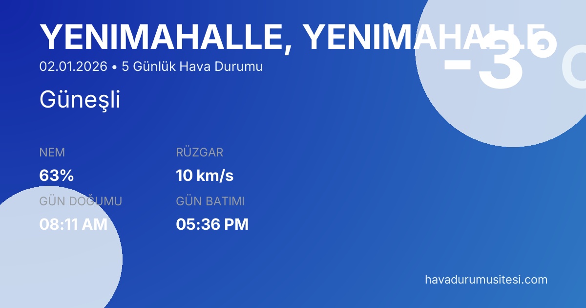 Yeni̇mahalle için 5 günlük detaylı hava durumu tahmini. Son güncelleme: 02.01.2026 15:44 | Veriler uluslararası meteoroloji standartlarına uygun olarak işlenmektedir.