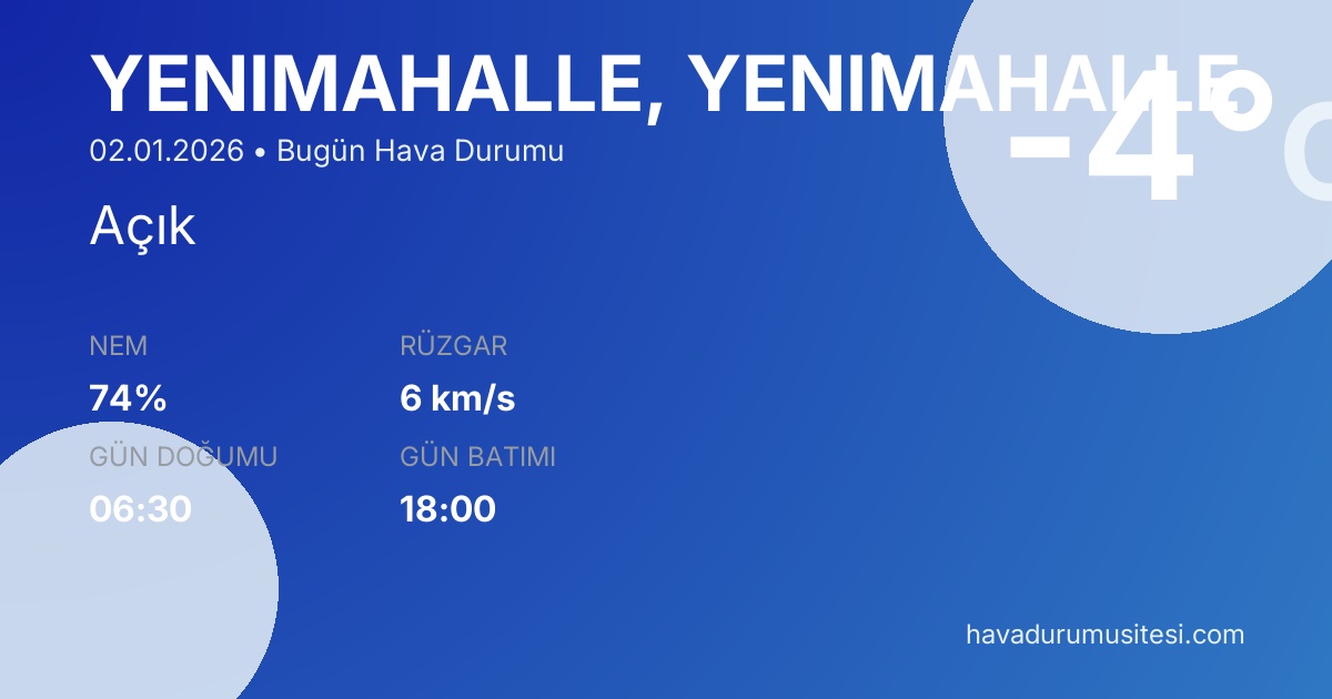 Yeni̇mahalle bugün hava durumu tahminleri düzenli olarak güncellenmektedir. 7 günlük haftalık tahmin ve 30 günlük uzun vadeli tahmin sayfalarımız ile farklı zaman dilimleri için planlama yapabilirsiniz. Meteoroloji verileri güvenilir kaynaklardan alınmakta ve sürekli güncellenmektedir. Son güncelleme: 02.01.2026 21:01