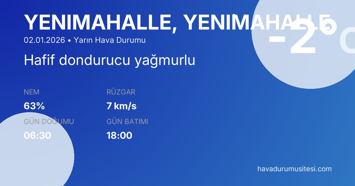 Yarın Yeni̇mahalle ilçesinde sabah saatlerinde minimum -8°C civarında başlayacak sıcaklıklar, öğle ve öğleden sonra saatlerinde maksimum 4°C seviyesine ulaşacaktır. Genel hava durumu Hafif dondurucu yağmurlu olarak tahmin edilmektedir. Yağış ihtimali %69 olduğu için şemsiye veya yağmurluk almanızı öneririz. Daha detaylı saat saat bilgi için Yeni̇mahalle saatlik hava durumu sayfamızı inceleyebilirsiniz. Ayrıca 5 günlük, 15 günlük ve 30 günlük tahminler ile uzun vadeli planlamalarınızı yapabilirsiniz.