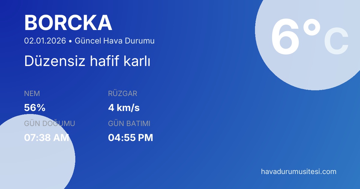 Borçka ilçesi, Artvi̇n iline bağlıdır. Şu anda sıcaklık 2°C ve hava durumu Parçalı Bulutlu. Hissedilen sıcaklık 1°C. Nem oranı %87. Rüzgar hızı 4 km/s. Borçka için bugün hava durumu, yarın hava durumu, 5 günlük tahmin ve 15 günlük tahmin sayfalarımızda detaylı bilgiler bulunmaktadır. Artvi̇n 15 günlük tahmin ve Artvi̇n 30 günlük tahmin sayfalarını da inceleyebilirsiniz.