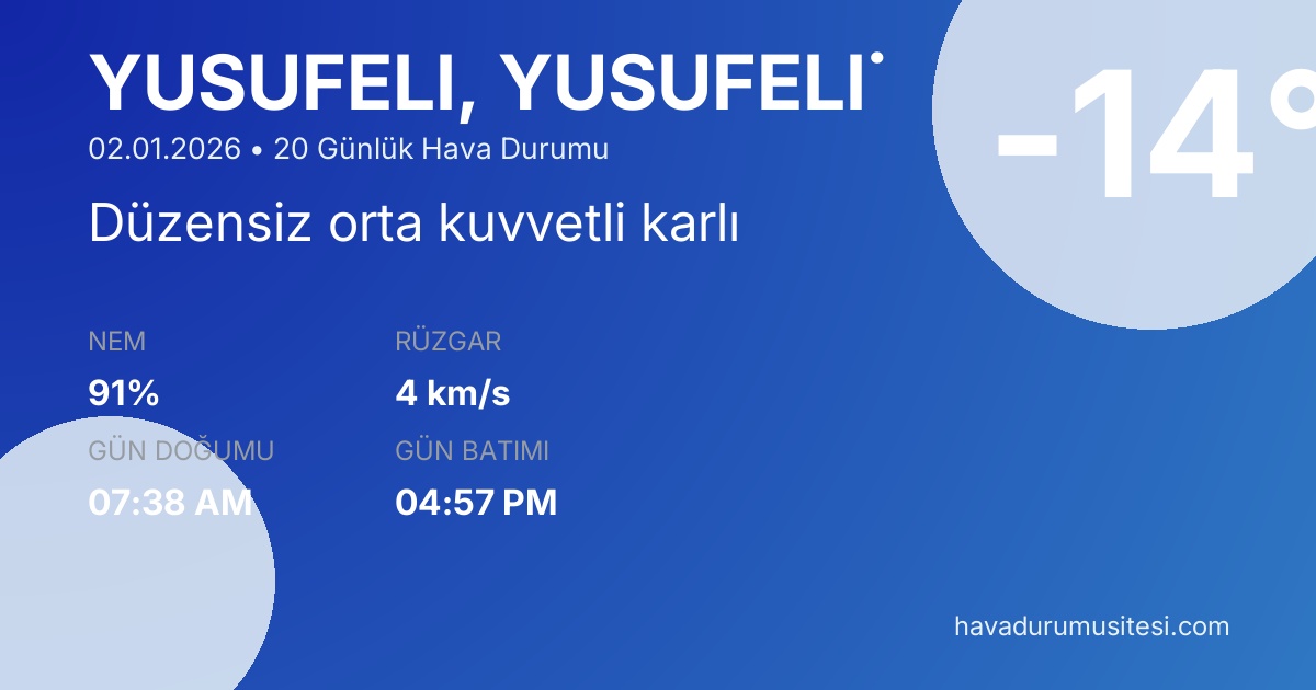 Yusufeli̇ için 20 günlük hava durumu tahminleri. Şu anda sıcaklık -14°C ve hava durumu Düzensiz orta kuvvetli karlı. Hissedilen sıcaklık -16°C. Nem oranı %91. Rüzgar hızı 4 km/s. Yusufeli̇ için güncel meteoroloji bilgileri, bugünkü hava durumu, yarınki tahmin ve 48 saatlik saatlik analiz sayfalarımızda detaylı bilgiler bulunmaktadır.