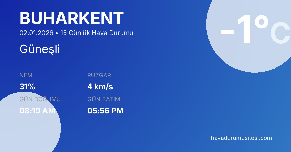 Önümüzdeki 15 gün boyunca Buharkent ilçesinde sıcaklıkların -4°C ile 18°C arasında seyretmesi beklenmektedir. Ortalama sıcaklık 10°C civarında olacaktır. 7 gün güneşli ve açık hava koşulları hakim olacak. Yaklaşık 3 gün yağışlı geçmesi bekleniyor. Kış mevsiminin özelliklerini taşıyan bu dönemde hava durumu tahminlerini düzenli takip etmeniz önerilir.