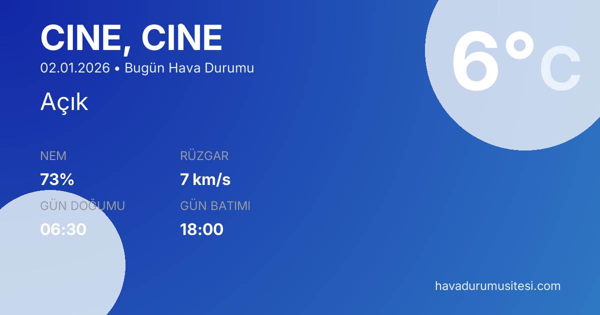 Çi̇ne bugün hava durumu tahminleri düzenli olarak güncellenmektedir. 7 günlük haftalık tahmin ve 30 günlük uzun vadeli tahmin sayfalarımız ile farklı zaman dilimleri için planlama yapabilirsiniz. Meteoroloji verileri güvenilir kaynaklardan alınmakta ve sürekli güncellenmektedir. Son güncelleme: 02.01.2026 07:51