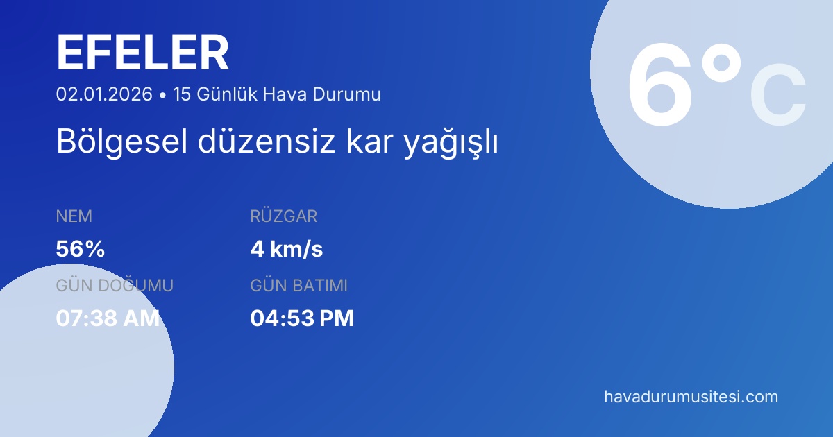 Efeler için 15 günlük detaylı hava durumu tahmini. Son güncelleme: 02.01.2026 15:21 | Veriler uluslararası meteoroloji standartlarına uygun olarak işlenmektedir.