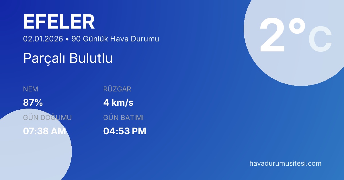 Efeler için 90 günlük hava durumu tahminleri. Şu anda sıcaklık 2°C ve hava durumu Parçalı Bulutlu. Hissedilen sıcaklık 2°C. Nem oranı %87. Rüzgar hızı 4 km/s. Efeler için güncel meteoroloji bilgileri, bugünkü hava durumu, yarınki tahmin ve 48 saatlik saatlik analiz sayfalarımızda detaylı bilgiler bulunmaktadır.