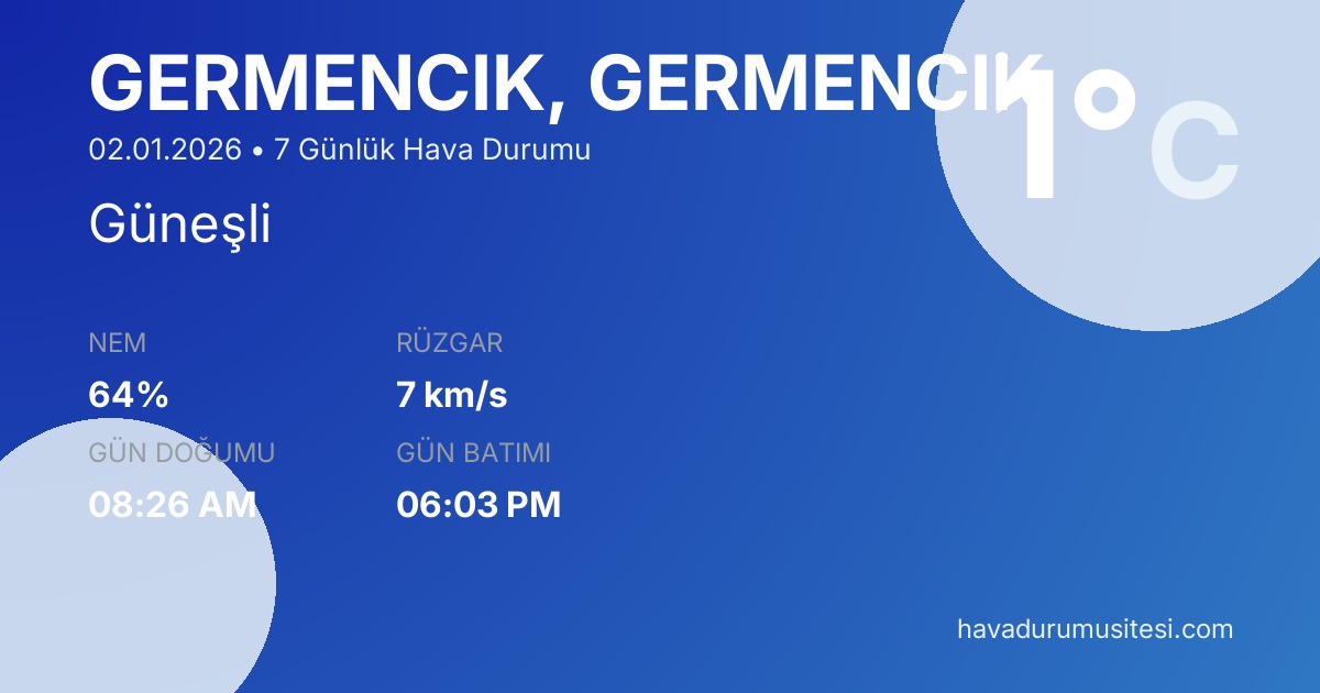 Germenci̇k için 7 günlük detaylı hava durumu tahmini. Son güncelleme: 02.01.2026 13:44 | Veriler uluslararası meteoroloji standartlarına uygun olarak işlenmektedir.