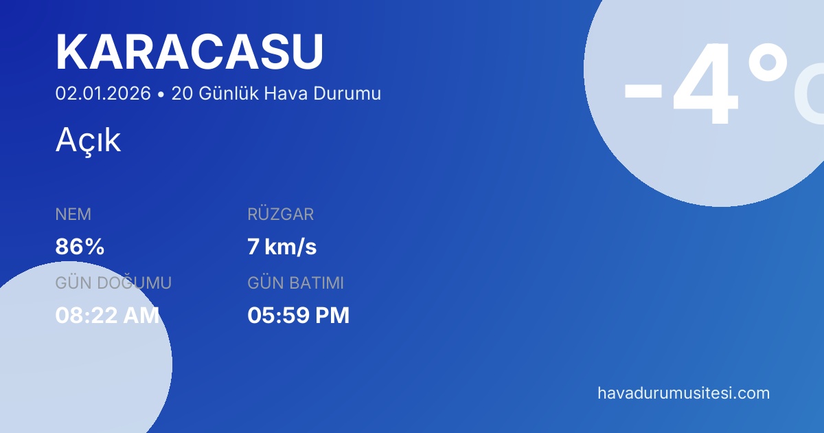 Karacasu için 20 günlük hava durumu tahminleri. Şu anda sıcaklık -4°C ve hava durumu Açık. Hissedilen sıcaklık -6°C. Nem oranı %86. Rüzgar hızı 7 km/s. Karacasu için güncel meteoroloji bilgileri, bugünkü hava durumu, yarınki tahmin ve 48 saatlik saatlik analiz sayfalarımızda detaylı bilgiler bulunmaktadır.