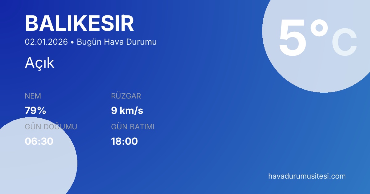 Balikesi̇r bugün hava durumu tahminleri düzenli olarak güncellenmektedir. 7 günlük haftalık tahmin ve 30 günlük uzun vadeli tahmin sayfalarımız ile farklı zaman dilimleri için planlama yapabilirsiniz. Meteoroloji verileri güvenilir kaynaklardan alınmakta ve sürekli güncellenmektedir. Son güncelleme: 02.01.2026 09:50