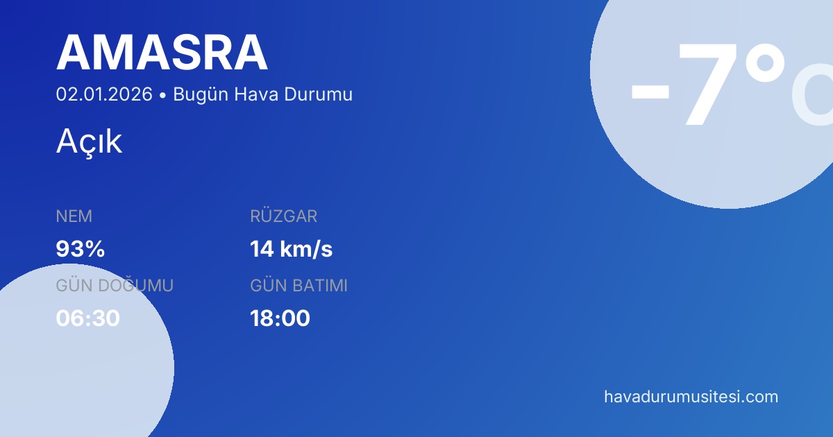 Amasra bugün hava durumu tahminleri düzenli olarak güncellenmektedir. 7 günlük haftalık tahmin ve 30 günlük uzun vadeli tahmin sayfalarımız ile farklı zaman dilimleri için planlama yapabilirsiniz. Meteoroloji verileri güvenilir kaynaklardan alınmakta ve sürekli güncellenmektedir. Son güncelleme: 02.01.2026 09:52