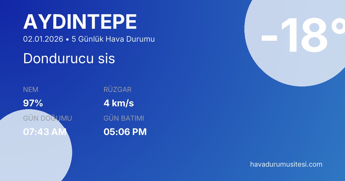 Önümüzdeki 5 gün boyunca sıcaklıkların -20°C ile 1°C arasında seyretmesi beklenmektedir. Aydintepe hava durumu tahminleri düzenli olarak güncellenmektedir. Meteoroloji verileri güvenilir kaynaklardan alınmakta ve sürekli güncellenmektedir. Son güncelleme: 02.01.2026 17:13