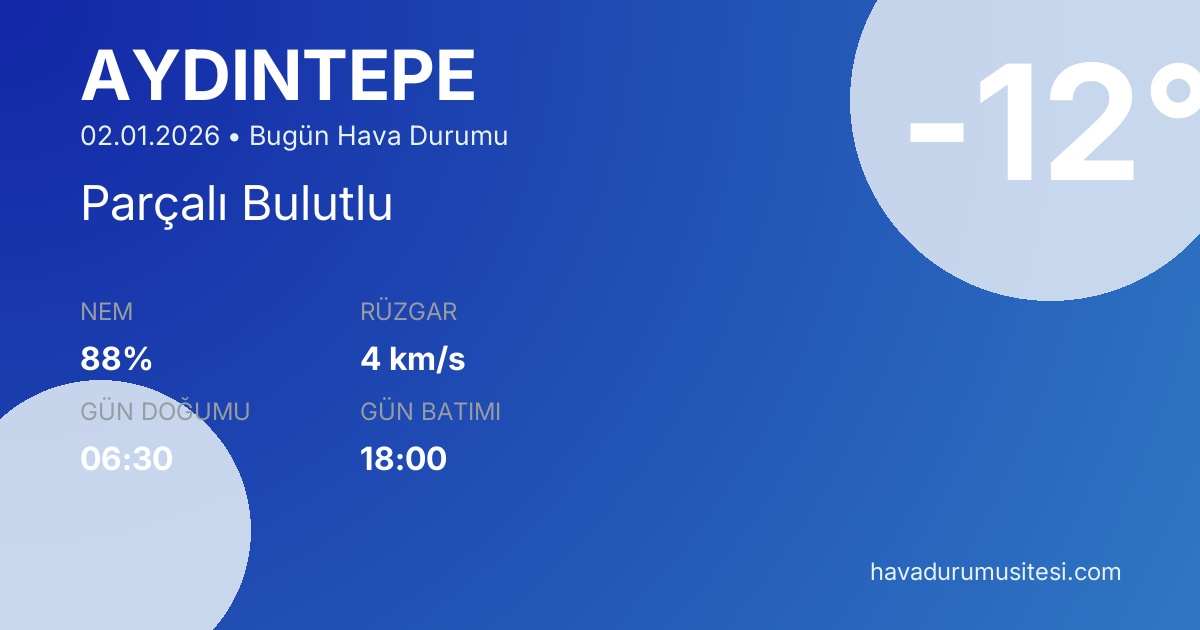 Aydintepe bugün hava durumu tahminleri düzenli olarak güncellenmektedir. 7 günlük haftalık tahmin ve 30 günlük uzun vadeli tahmin sayfalarımız ile farklı zaman dilimleri için planlama yapabilirsiniz. Meteoroloji verileri güvenilir kaynaklardan alınmakta ve sürekli güncellenmektedir. Son güncelleme: 02.01.2026 13:37