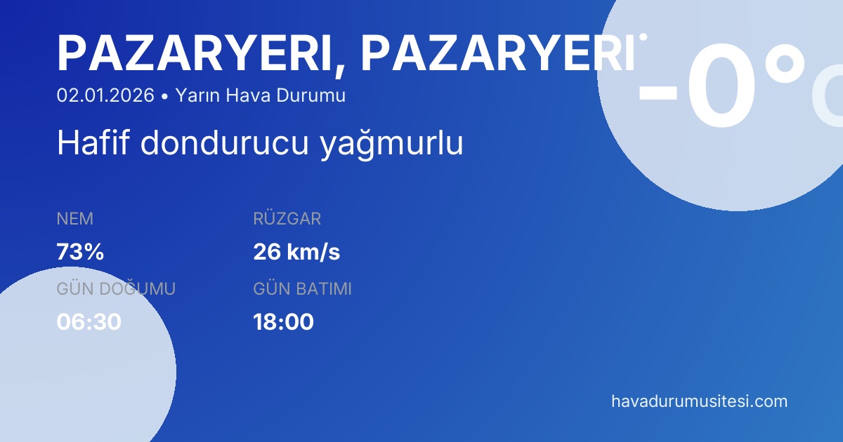 Yarın Pazaryeri̇ ilçesinde sabah saatlerinde minimum -8°C civarında başlayacak sıcaklıklar, öğle ve öğleden sonra saatlerinde maksimum 8°C seviyesine ulaşacaktır. Genel hava durumu Hafif dondurucu yağmurlu olarak tahmin edilmektedir. Yağış ihtimali %86 olduğu için şemsiye veya yağmurluk almanızı öneririz. Daha detaylı saat saat bilgi için Pazaryeri̇ saatlik hava durumu sayfamızı inceleyebilirsiniz. Ayrıca 5 günlük, 15 günlük ve 30 günlük tahminler ile uzun vadeli planlamalarınızı yapabilirsiniz.