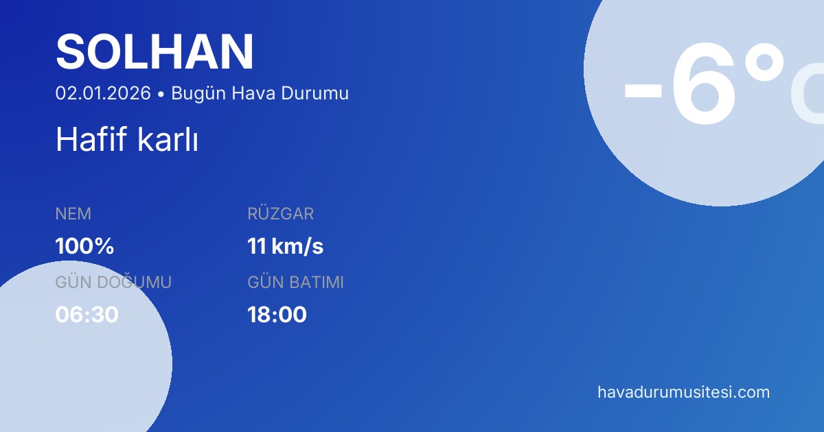Solhan bugün hava durumu tahminleri düzenli olarak güncellenmektedir. 7 günlük haftalık tahmin ve 30 günlük uzun vadeli tahmin sayfalarımız ile farklı zaman dilimleri için planlama yapabilirsiniz. Meteoroloji verileri güvenilir kaynaklardan alınmakta ve sürekli güncellenmektedir. Son güncelleme: 02.01.2026 09:50