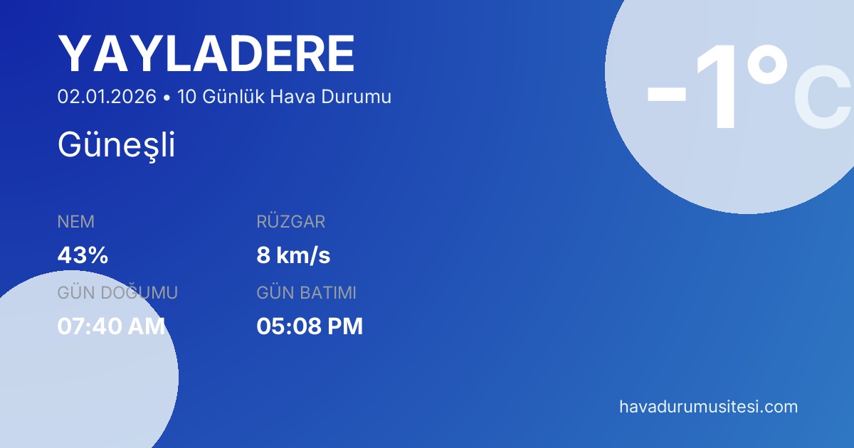 Yayladere için 10 günlük detaylı hava durumu tahmini. Son güncelleme: 02.01.2026 15:50 | Veriler uluslararası meteoroloji standartlarına uygun olarak işlenmektedir.