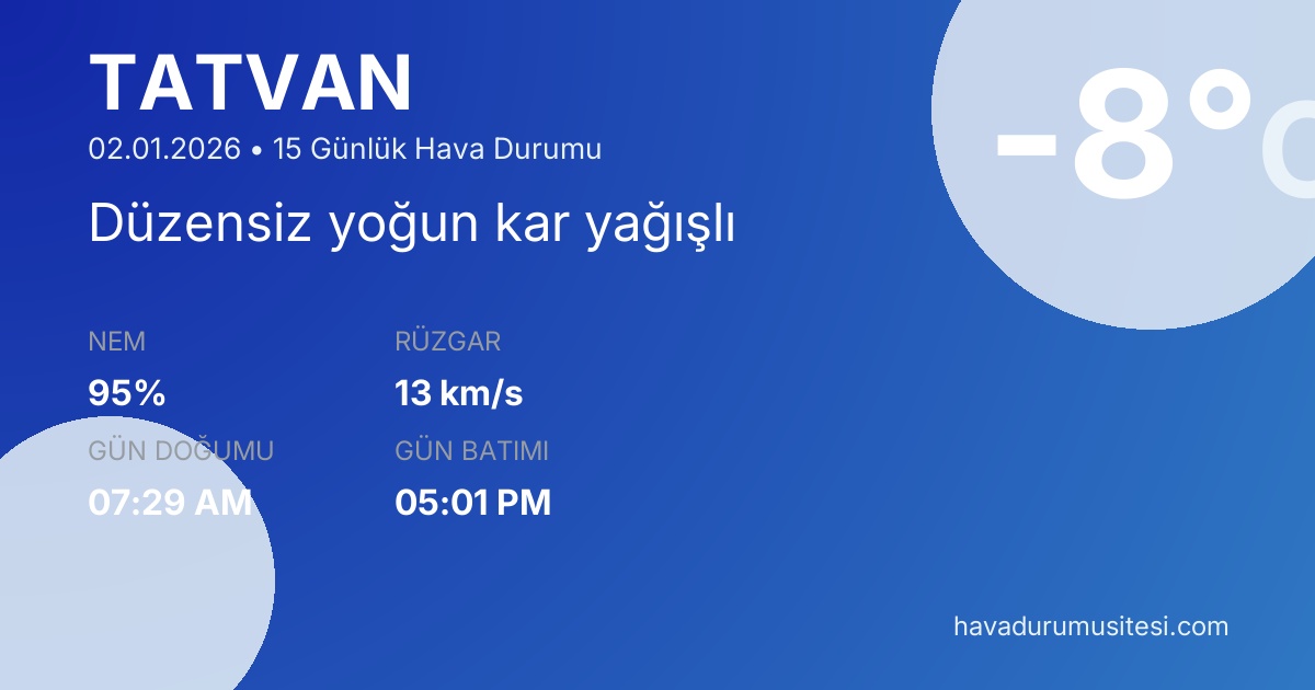 Tatvan için 15 günlük detaylı hava durumu tahmini. Son güncelleme: 02.01.2026 07:20 | Veriler uluslararası meteoroloji standartlarına uygun olarak işlenmektedir.