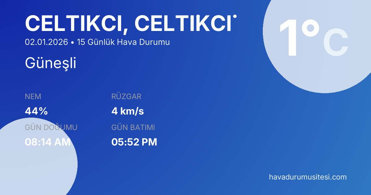 Çelti̇kçi̇ 15 günlük hava durumu tahminleri düzenli olarak güncellenmektedir. Meteoroloji verileri güvenilir kaynaklardan alınmakta ve sürekli güncellenmektedir. Son güncelleme: 02.01.2026 15:25