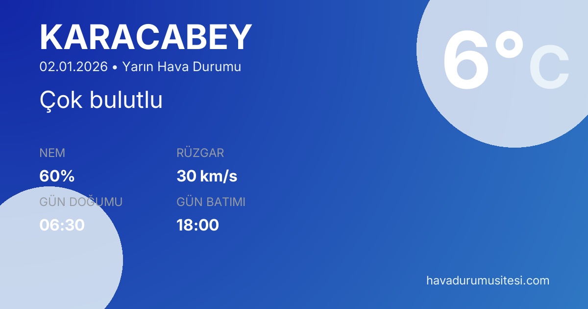 Karacabey yarın hava durumu tahminleri düzenli olarak güncellenmektedir. Meteoroloji verileri güvenilir kaynaklardan alınmakta ve sürekli güncellenmektedir. Son güncelleme: 02.01.2026 09:07