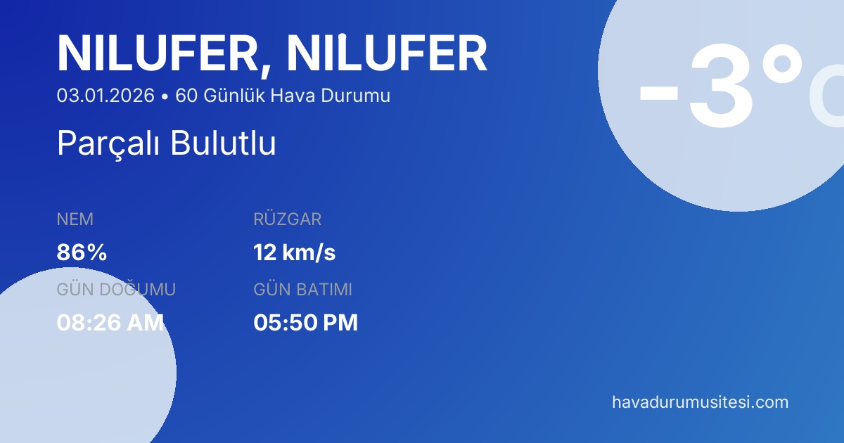 Ni̇lüfer için 60 günlük detaylı hava durumu tahmini. Son güncelleme: 03.01.2026 06:52 | Veriler uluslararası meteoroloji standartlarına uygun olarak işlenmektedir.