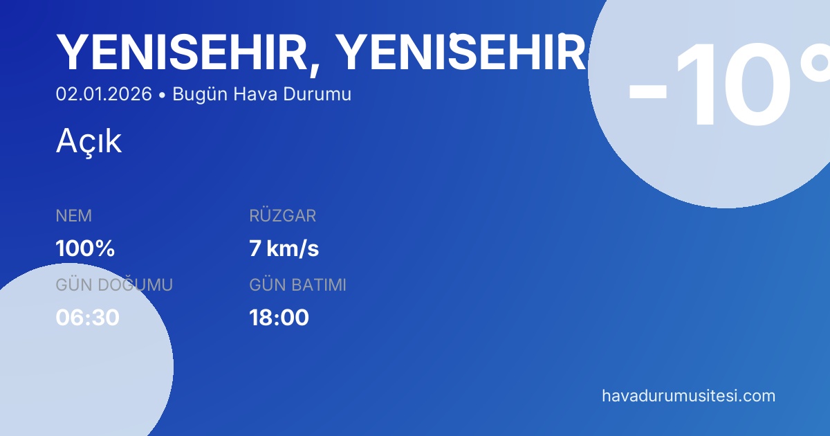Yeni̇şehi̇r için bugünün hava durumu bilgileri. Şu anda sıcaklık -10°C ve hava durumu Açık. Hissedilen sıcaklık -14°C. Nem oranı %100. Rüzgar hızı 7 km/s. Bugün sıcaklıkların -7°C ile 4°C arasında seyretmesi beklenmektedir. Yeni̇şehi̇r için hava durumu, yarın, 5 günlük, 15 günlük ve saatlik tahmin sayfalarımızda detaylı bilgiler bulunmaktadır. Bursa ana sayfası ve Bursa 15 günlük tahmin sayfalarını da inceleyebilirsiniz.