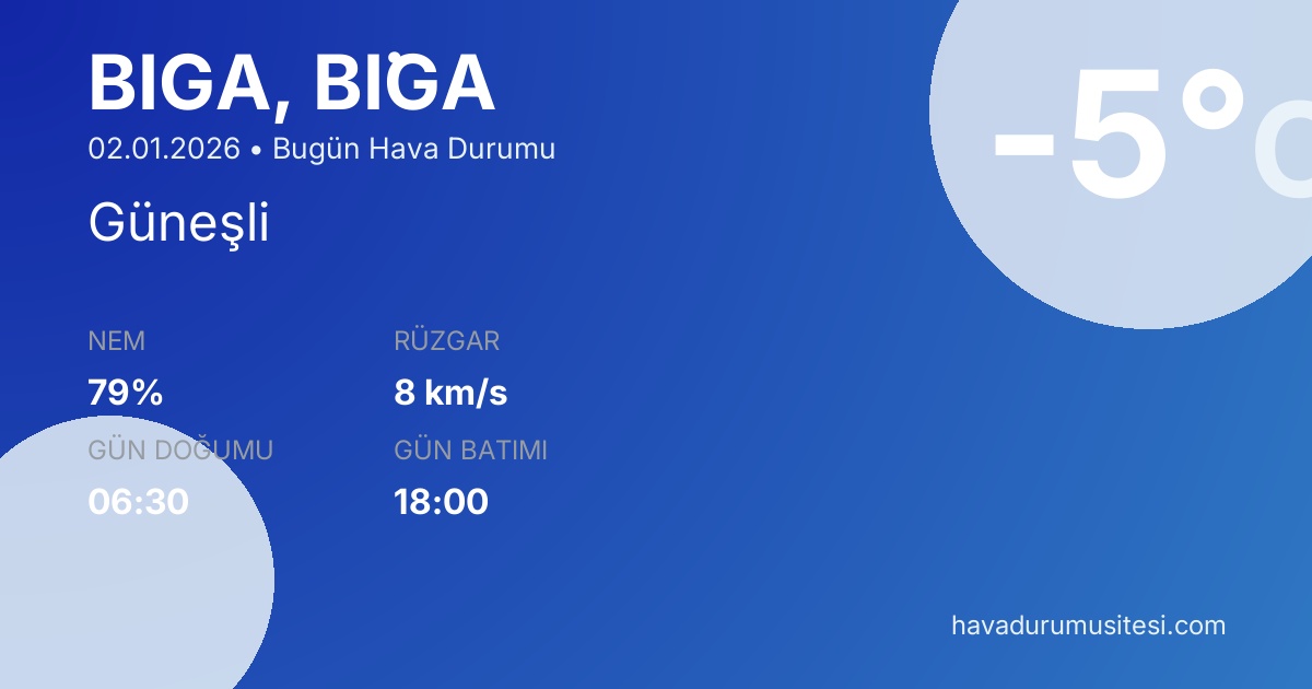 Bi̇ga bugün hava durumu tahminleri düzenli olarak güncellenmektedir. 7 günlük haftalık tahmin ve 30 günlük uzun vadeli tahmin sayfalarımız ile farklı zaman dilimleri için planlama yapabilirsiniz. Meteoroloji verileri güvenilir kaynaklardan alınmakta ve sürekli güncellenmektedir. Son güncelleme: 02.01.2026 13:36