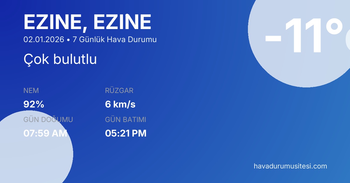 Ezi̇ne için 7 günlük detaylı hava durumu tahmini. Son güncelleme: 02.01.2026 10:07 | Veriler uluslararası meteoroloji standartlarına uygun olarak işlenmektedir.