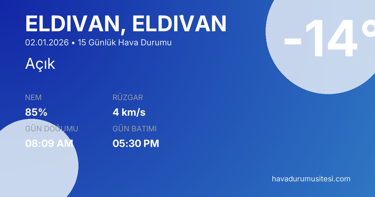 Önümüzdeki 15 gün boyunca Eldi̇van ilçesinde sıcaklıkların -10°C ile 9°C arasında seyretmesi beklenmektedir. Ortalama sıcaklık 0°C civarında olacaktır. 8 gün güneşli ve açık hava koşulları hakim olacak. Yaklaşık 3 gün yağışlı geçmesi bekleniyor. Kış mevsiminin özelliklerini taşıyan bu dönemde hava durumu tahminlerini düzenli takip etmeniz önerilir.