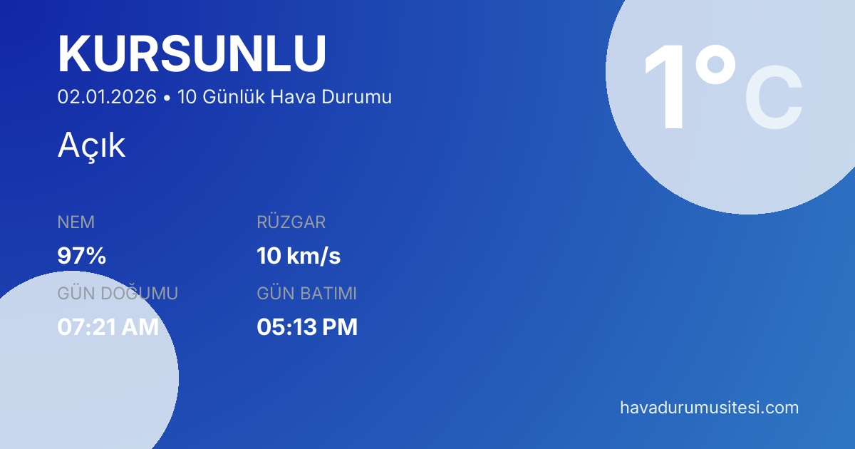 Önümüzdeki 10 gün boyunca sıcaklıkların -17°C ile 7°C arasında seyretmesi beklenmektedir. 5 gün yağışlı geçecek. 3 gün güneşli hava beklenmektedir. Kurşunlu hava durumu tahminleri düzenli olarak güncellenmektedir. Meteoroloji verileri güvenilir kaynaklardan alınmakta ve sürekli güncellenmektedir. Son güncelleme: 02.01.2026 10:00