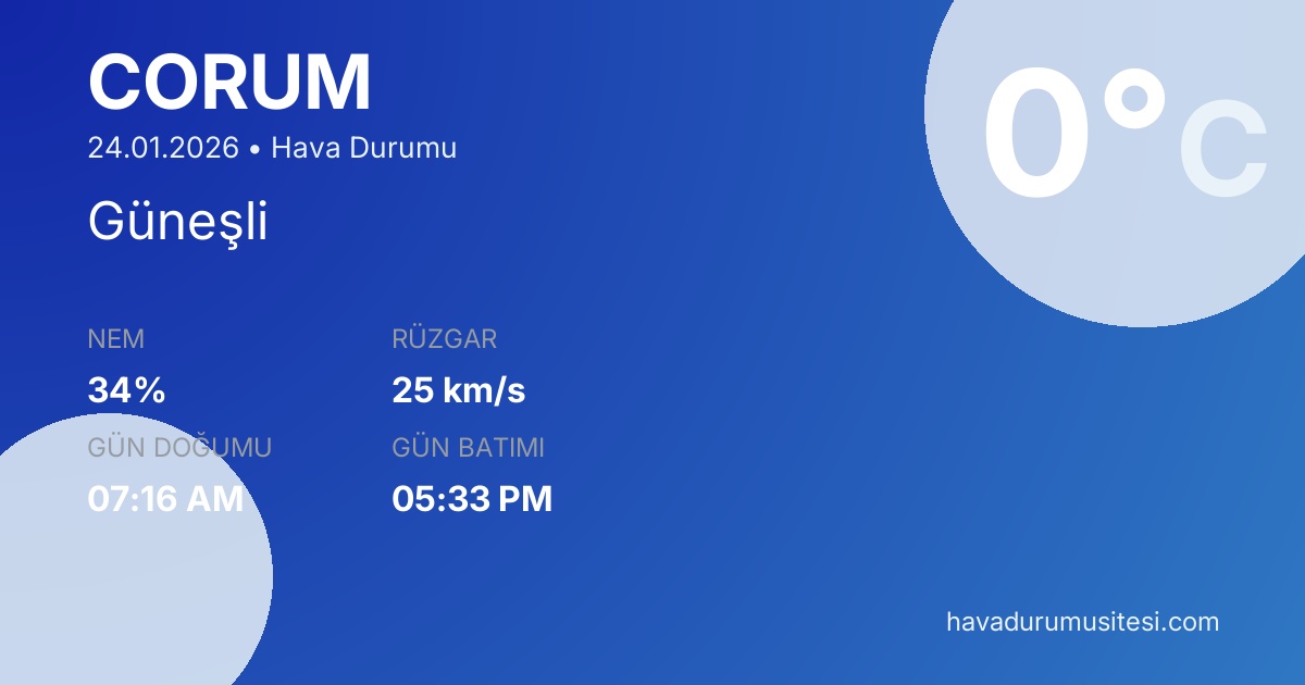 Çorum için farklı zaman dilimlerinde hava durumu tahminleri sunuyoruz. Çorum meteoroloji ana sayfası ile güncel bilgilere, bugünkü hava durumu ve yarınki tahmin sayfaları ile kısa vadeli tahminlere, 5 günlük hava durumu tahminler ile haftalık planlamalara, 30 günlük uzun vadeli tahmin ile aylık planlamalara ulaşabilirsiniz. Ayrıca saatlik meteoroloji takibi ile gün içi aktivitelerinizi en iyi şekilde planlayabilirsiniz.