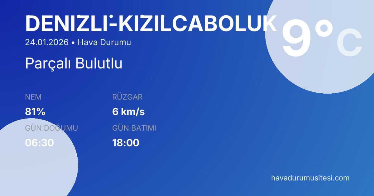 Deni̇zli̇ için güncel hava durumu bilgileri. Şu anda sıcaklık 9°C ve hava durumu Parçalı Bulutlu. Hissedilen sıcaklık 7°C. Nem oranı %71. Rüzgar hızı 12 km/s. Deni̇zli̇ için bugünkü meteoroloji verileri, yarınki hava durumu tahmini, 5 günlük hava durumu raporu ve 15 günlük detaylı tahmin sayfalarımızda detaylı bilgiler bulunmaktadır.